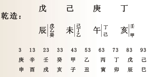 命主83周岁进入戊辰大运,完全为用神印星到位之大运。在此步大运要特别注意:2013年癸巳流年,此流年巳午未有会南方火之势,流年癸水与原命局时干丁火相冲、而激怒旺火,所以此年命主要特别注意心脏方面的保养和血压的控制(以防止突发性脑出血)。由于李老先生几十年以来、捐助世界各地的慈善事业,积下无量功德。所以2013年的病灾,提前预防调养,定可以平安度过。